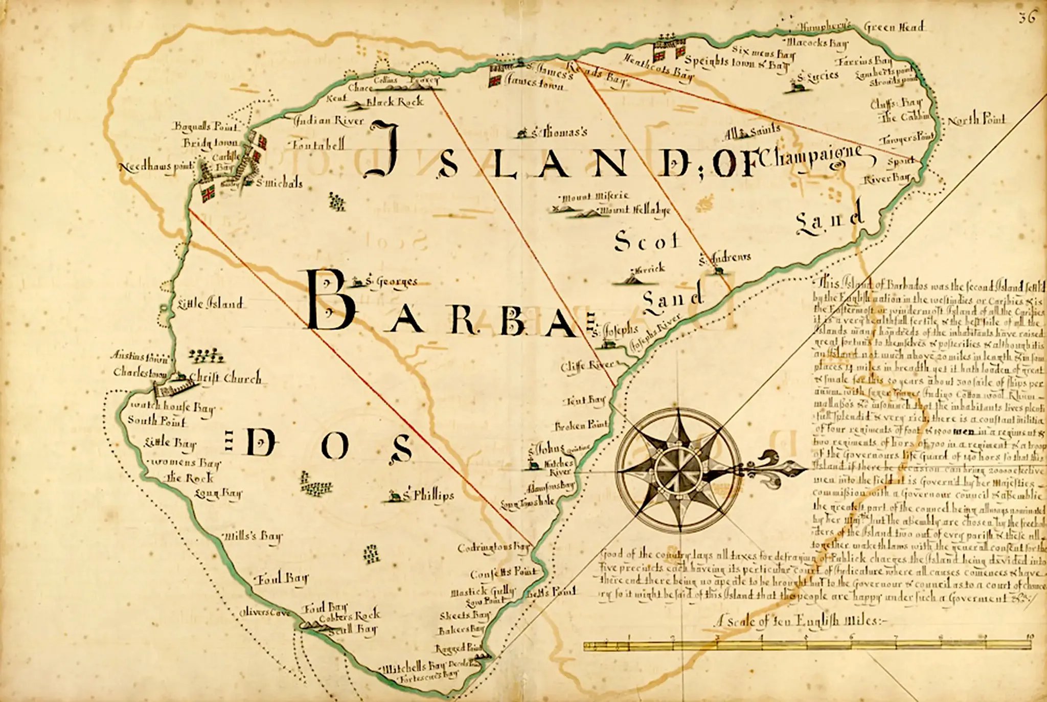 “This island of Barbados was the second Island settled by the English nation in the West Indies or Caribies & is the Eastmost or Windermost Island of all the Caribies it is very healthfully fertile & the best soil of all the Islands many hundreds of the inhabitants have raised great fortune’s to themselves & properties & although it is an Island not much above 20 miles in length & in some places 14 miles in breath yet it hath loaded of great & finale for this 50 years about 300 sale of ships per annum with Sugar Ginger Indigo Cotton Wool Rhum – mallaso’s & insomuch that the inhabitants lives plentiful splendid & very rich; there is a constant militia of four regiments of foot & 1500 men in a regiment & two regiments of hors of 700 in a regiment & a troop of the Governours Lite Guard of 140 hors so that this Island if there be occasion to can bring 20000 effective men into the field it is Govern’d by her Majesties commission with a Governour council & assemble the greatest part of the council being always nominated by her Majistie but the assembly are chosen by the freeholders of he Island two out of every parish & these all together taketh laws with the general consent for the good of the country lays all taxes for defraying of Public charges the island being divided into five precincts each having its particular court of Judicature where all causes comences & have there end being no apeale to bebrought but to the Governor & council as to a court of chancery so it might be said of this Island that the people are happy under such a Government.”