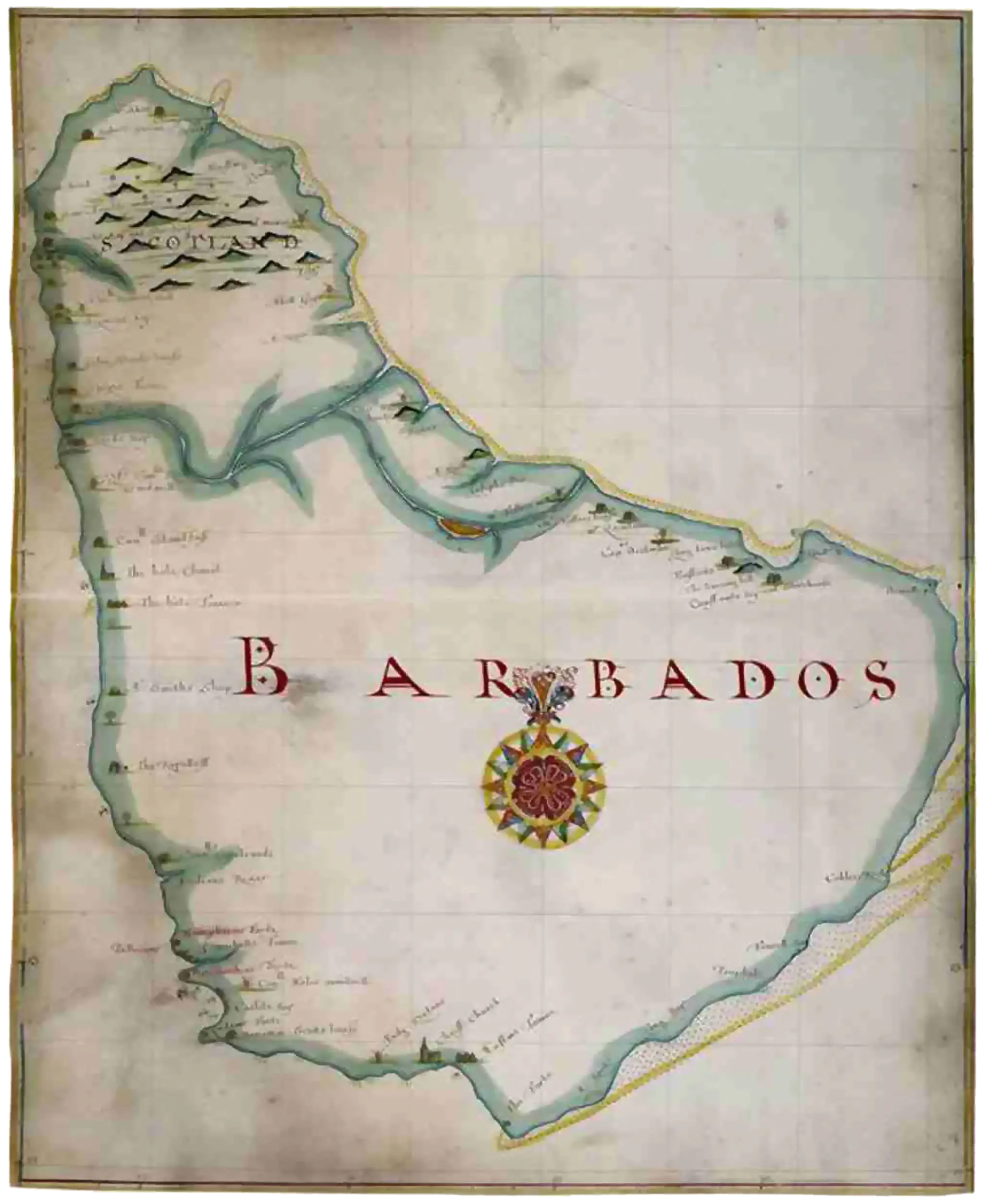 The Iland of Barbados by John Thornton at ye Platt in ye Minories And by Will Fisher at ye Postorn Gate on Tower Hill, London. 25½ x 42 cms.